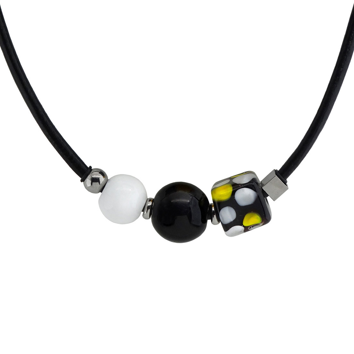 Колье изготовлено из натуральной кожи, муранского стекла и гипоаллергенной ювелирной стали, что очень важно для людей с чувствительной кожей. Металл не темнеет и не подвергается воздействиям окружающей среды, надолго обеспечивая красивый внешний вид изделия. Длина колье - 46 см + 5 см. удлиняющая цепочка. Диаметр стеклянных шароов - 1,6 и 1,2 см. Размер куба - 1,2х1,4 см. Вес - 32 гр.