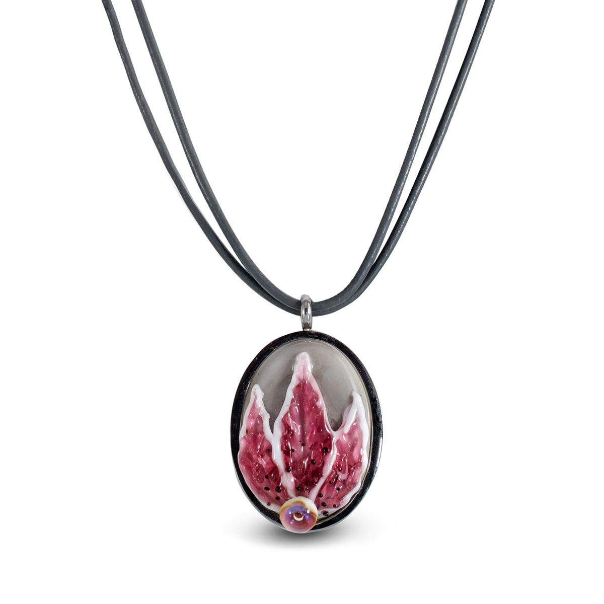 Колье изготовлено из натуральной кожи, муранского стекла и гипоаллергенной ювелирной стали, что очень важно для людей с чувствительной кожей. Металл не темнеет и не подвергается воздействиям окружающей среды, надолго обеспечивая красивый внешний вид изделия. Длина колье - 46 см + 5 см. удлиняющая цепочка. Размер стеклянного элемента - 4х3 см.  Вес - 25 гр.