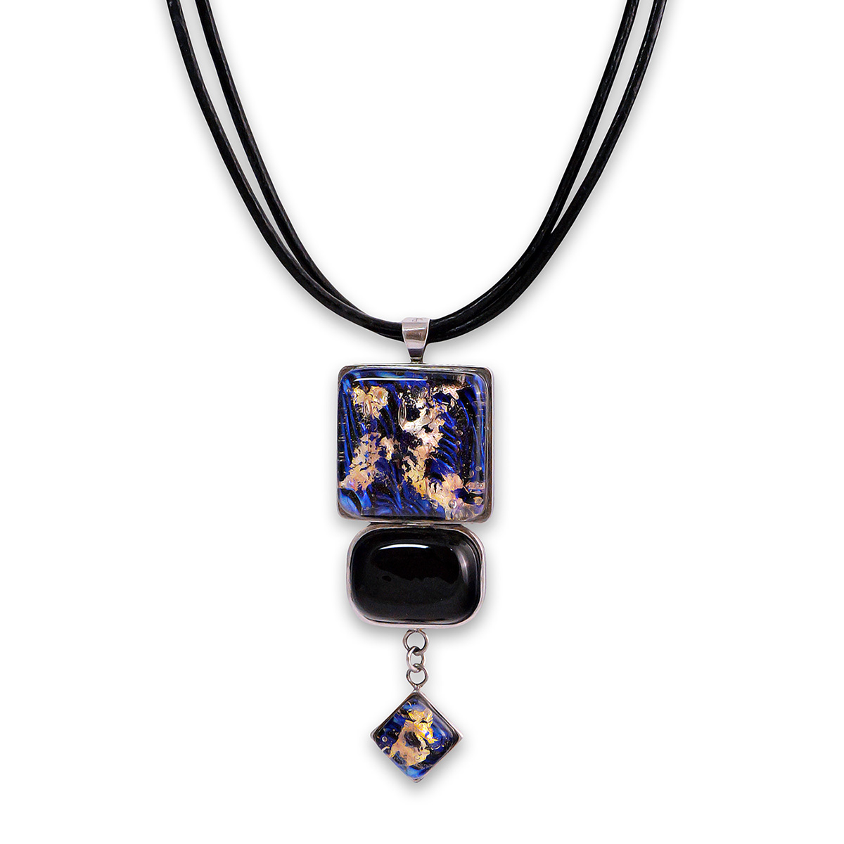 Колье изготовлено из натуральной кожи, муранского стекла и гипоаллергенной ювелирной стали, что очень важно для людей с чувствительной кожей. Металл не темнеет и не подвергается воздействиям окружающей среды, надолго обеспечивая красивый внешний вид изделия. Длина колье - 46 см + 5 см. удлиняющая цепочка. Длина кулона - 6 см. Размер стеклянных элементов - 2,2х2,2, 2х1,5 и 1 см. Вес - 28 гр.