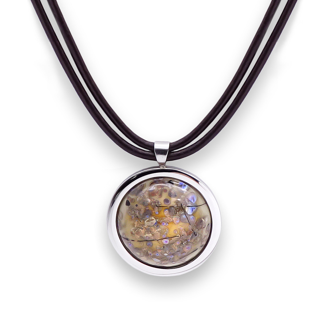 Колье изготовлено из натуральной кожи, муранского стекла и гипоаллергенной ювелирной стали, что очень важно для людей с чувствительной кожей. Металл не темнеет и не подвергается воздействиям окружающей среды, надолго обеспечивая красивый внешний вид изделия. Длина колье - 46 см + 5 см. удлиняющая цепочка. Диаметр стеклянного элемента - 2,5 см. Вес -  21 гр.