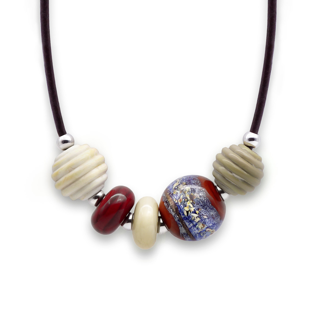 Колье изготовлено из натуральной кожи, муранского стекла и гипоаллергенной ювелирной стали, что очень важно для людей с чувствительной кожей. Металл не темнеет и не подвергается воздействиям окружающей среды, надолго обеспечивая красивый внешний вид изделия. Длина колье - 46 см + 5 см. удлиняющая цепочка. Диаметр стеклянных бусин - 1,5, 1,8 и 2,2 см. Рондели 0,9х1,6 и 1х1,8 см. Вес - 41 гр.