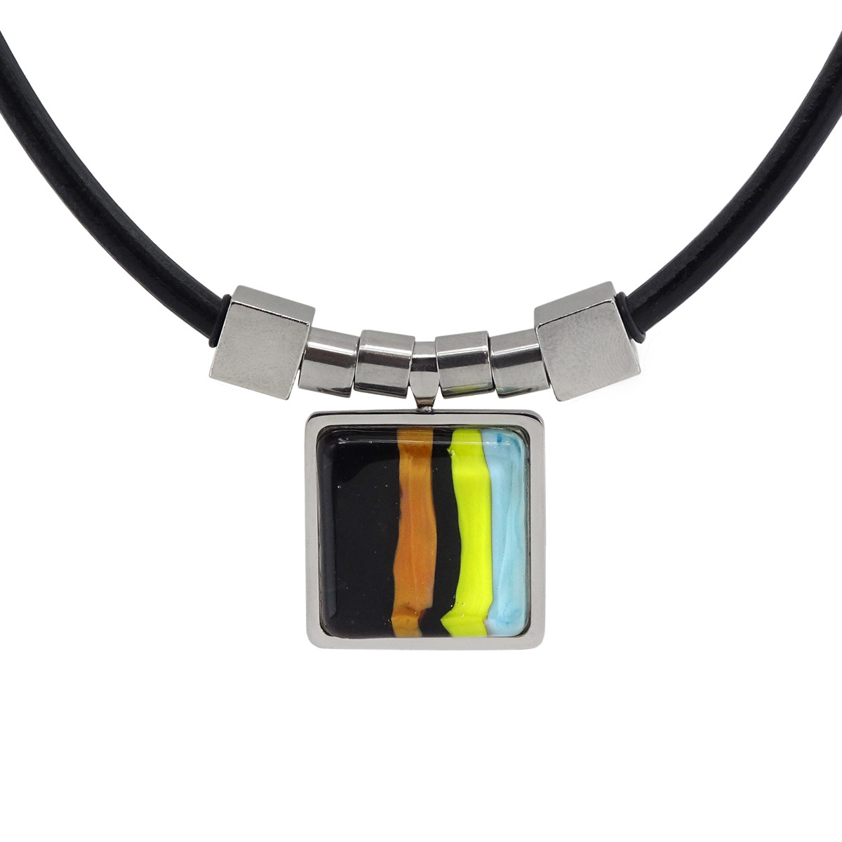 Колье изготовлено из натуральной кожи, муранского стекла и гипоаллергенной ювелирной стали, что очень важно для людей с чувствительной кожей. Металл не темнеет и не подвергается воздействиям окружающей среды, надолго обеспечивая красивый внешний вид изделия. Длина колье - 46 см + 5 см. удлиняющая цепочка. Размер стеклянного элемента - 2,2х2,2 см.  Вес - 20 гр.