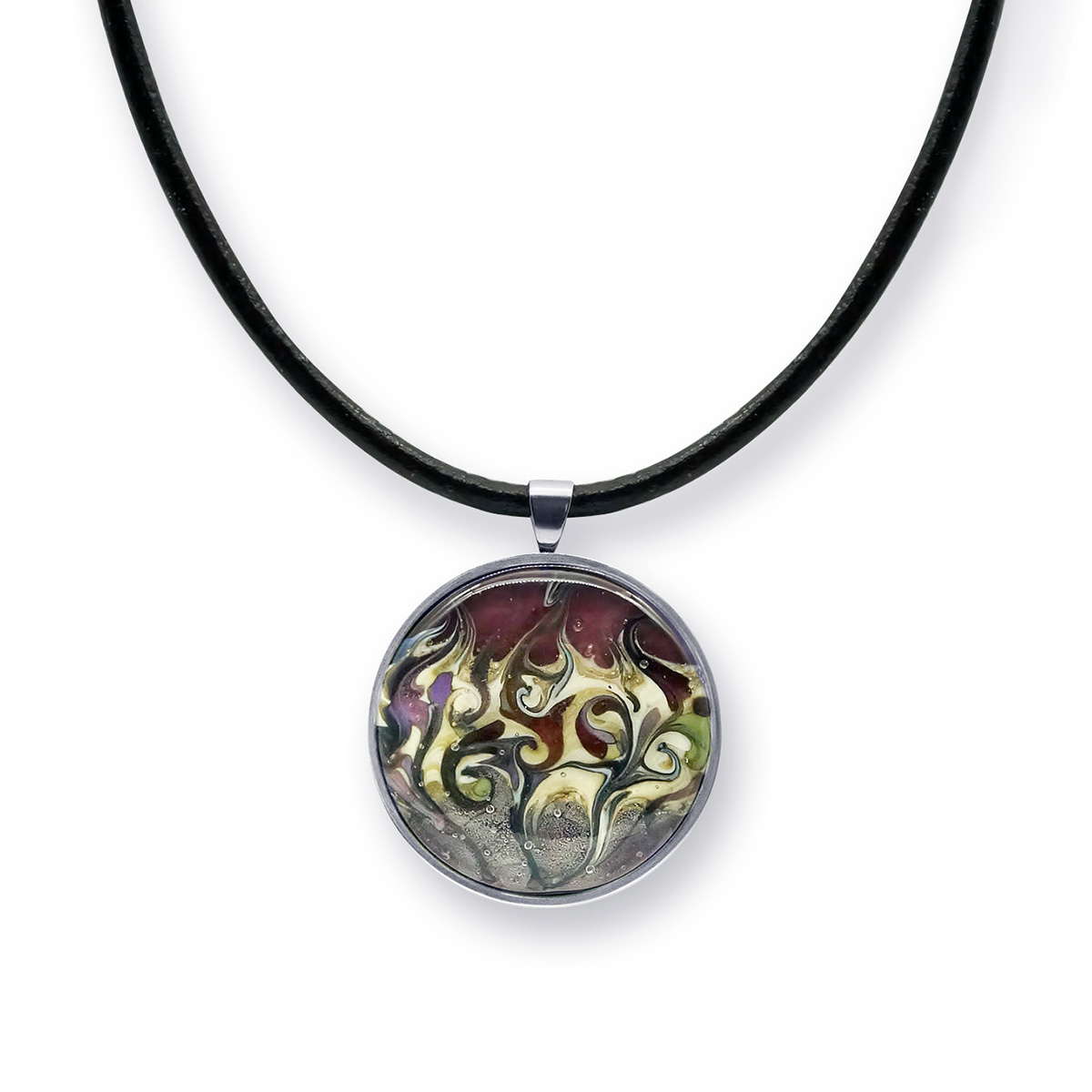 Колье изготовлено из натуральной кожи, муранского стекла и гипоаллергенной ювелирной стали, что очень важно для людей с чувствительной кожей. Металл не темнеет и не подвергается воздействиям окружающей среды, надолго обеспечивая красивый внешний вид изделия. Длина колье - 46 см + 5 см. удлиняющая цепочка. Диаметр стеклянного элемента - 3 см. Вес - 25 гр.
