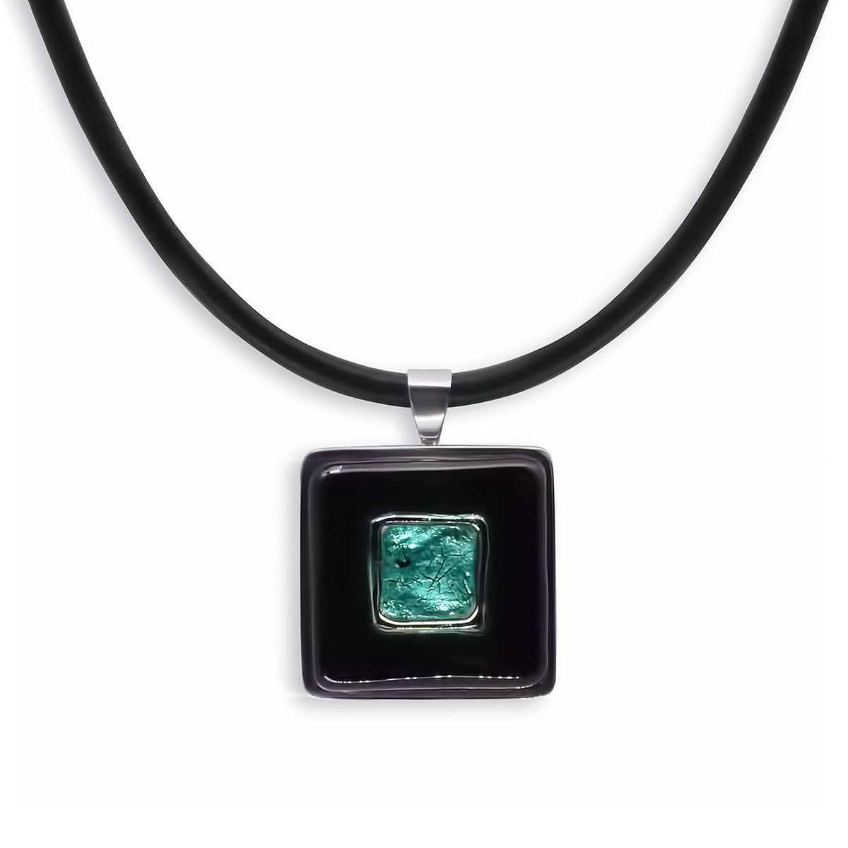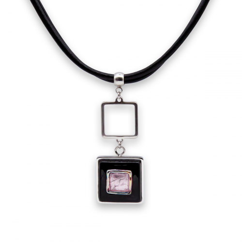 Колье изготовлено из натуральной кожи, муранского стекла и гипоаллергенной ювелирной стали, что очень важно для людей с чувствительной кожей. Металл не темнеет и не подвергается воздействиям окружающей среды, надолго обеспечивая красивый внешний вид изделия. Длина колье - 46 см + 5 см. удлиняющая цепочка. Размер стеклянного элемента - 2,2х2,2 см.  Вес - 18 гр.
