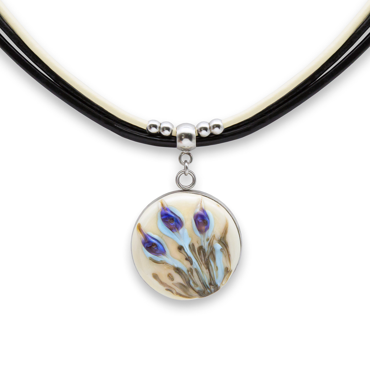Колье изготовлено из натуральной кожи, муранского стекла и гипоаллергенной ювелирной стали, что очень важно для людей с чувствительной кожей. Металл не темнеет и не подвергается воздействиям окружающей среды, надолго обеспечивая красивый внешний вид изделия. Длина колье - 46 см + 5 см. удлиняющая цепочка. Диаметр стеклянного элемента - 2,5 см. Вес - 15 гр.
