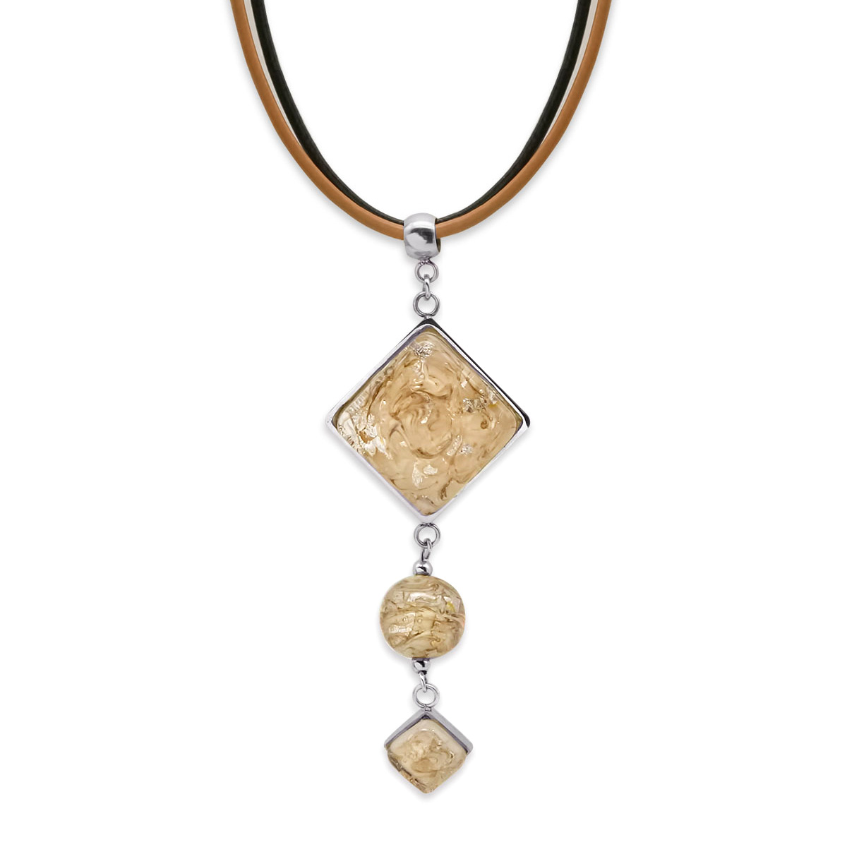 Колье изготовлено из натуральной кожи, муранского стекла и гипоаллергенной ювелирной стали, что очень важно для людей с чувствительной кожей. Металл не темнеет и не подвергается воздействиям окружающей среды, надолго обеспечивая красивый внешний вид изделия. Длина колье - 46 см + 5 см. удлиняющая цепочка. Длина кулона - 8,5 см. Размер стеклянного элемента - 3х3 и 1х1 см, диаметр шара 1,2 см. Вес - 26 гр.