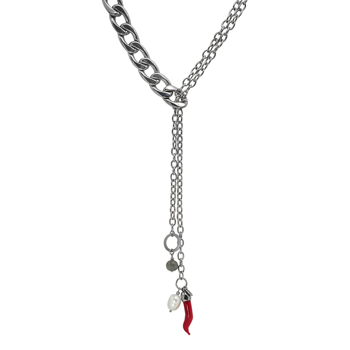 Колье изготовлено из муранского стекла и гипоаллергенной ювелирной стали, что очень важно для людей с чувствительной кожей. Металл не темнеет и не подвергается воздействиям окружающей среды, надолго обеспечивая красивый внешний вид изделия. Длина колье - 53 см + 5 см. удлиняющая цепочка. Длина подвески - 3,5 см. Вес - 89 гр.