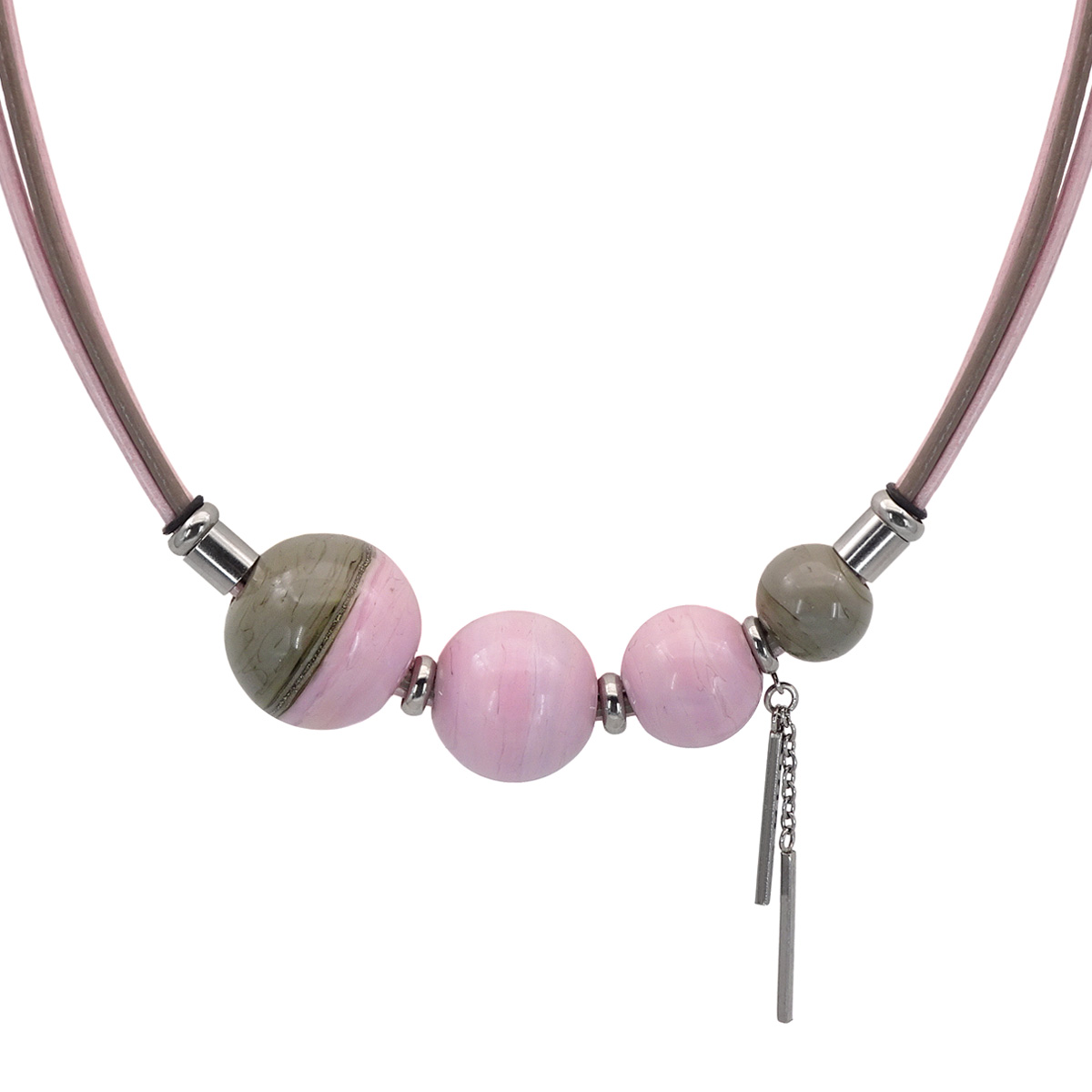 Колье изготовлено из натуральной кожи, муранского стекла и гипоаллергенной ювелирной стали, что очень важно для людей с чувствительной кожей. Металл не темнеет и не подвергается воздействиям окружающей среды, надолго обеспечивая красивый внешний вид изделия. Длина колье - 46 см + 5 см. удлиняющая цепочка. Диаметр стеклянных шаров - 1,2, 1,8 и 2,2 см. Вес - 51 гр.