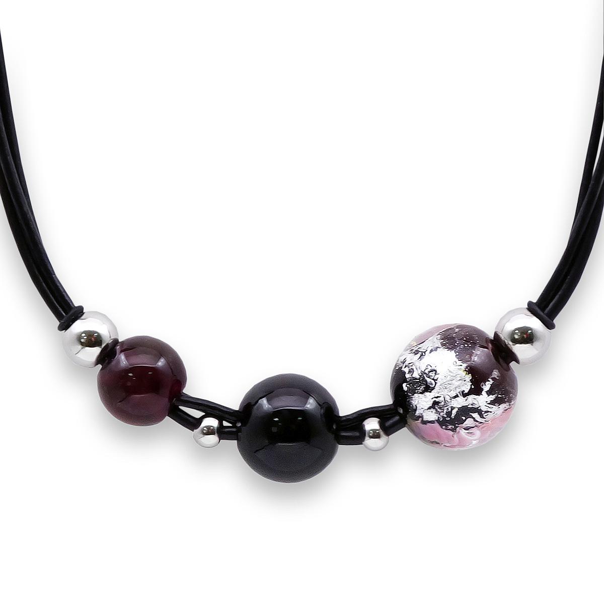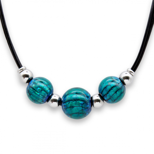 Колье изготовлено из натуральной кожи, муранского стекла и гипоаллергенной ювелирной стали, что очень важно для людей с чувствительной кожей. Металл не темнеет и не подвергается воздействиям окружающей среды, надолго обеспечивая красивый внешний вид изделия. Длина колье - 46 см + 5 см. удлиняющая цепочка. Диаметр стеклянных шаров - 1,5, 1,8 и 2,2 см. Вес - 41 гр.
