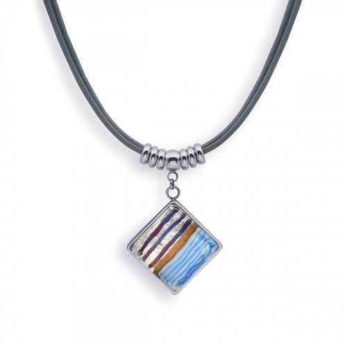 Колье изготовлено из натуральной кожи, муранского стекла и гипоаллергенной ювелирной стали, что очень важно для людей с чувствительной кожей. Металл не темнеет и не подвергается воздействиям окружающей среды, надолго обеспечивая красивый внешний вид изделия. Длина колье - 46 см + 5 см. удлиняющая цепочка. Размер стеклянного элемента - 3х3 см. Вес - 22 гр.