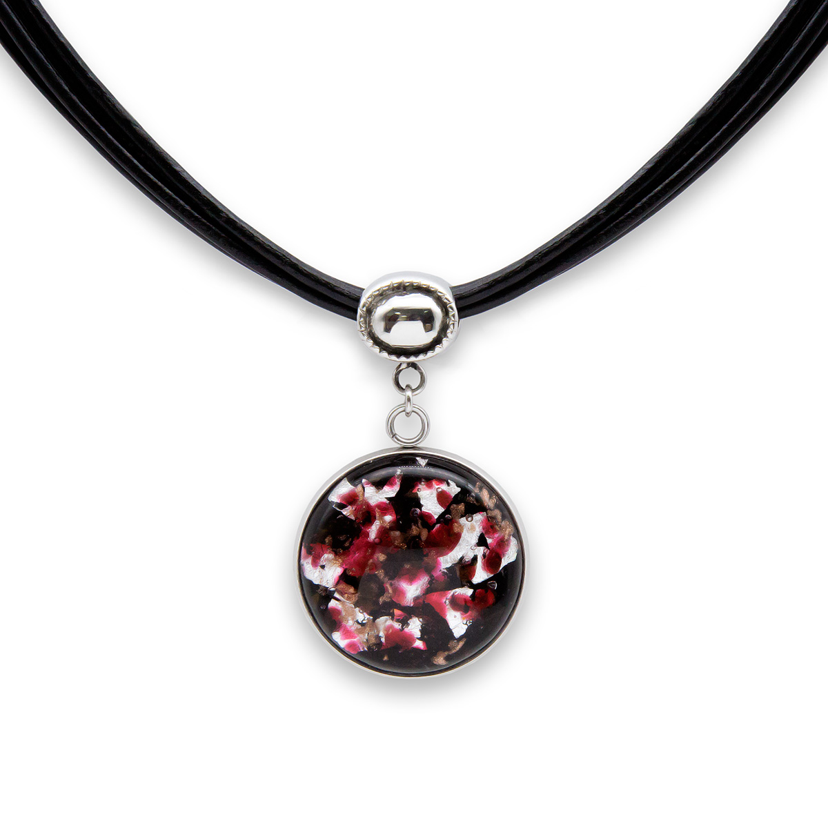 Колье изготовлено из натуральной кожи, муранского стекла и гипоаллергенной ювелирной стали, что очень важно для людей с чувствительной кожей. Металл не темнеет и не подвергается воздействиям окружающей среды, надолго обеспечивая красивый внешний вид изделия. Длина колье - 46 см + 5 см. удлиняющая цепочка. Диаметр стеклянного элемента - 2,5 см. Вес -  18 гр.