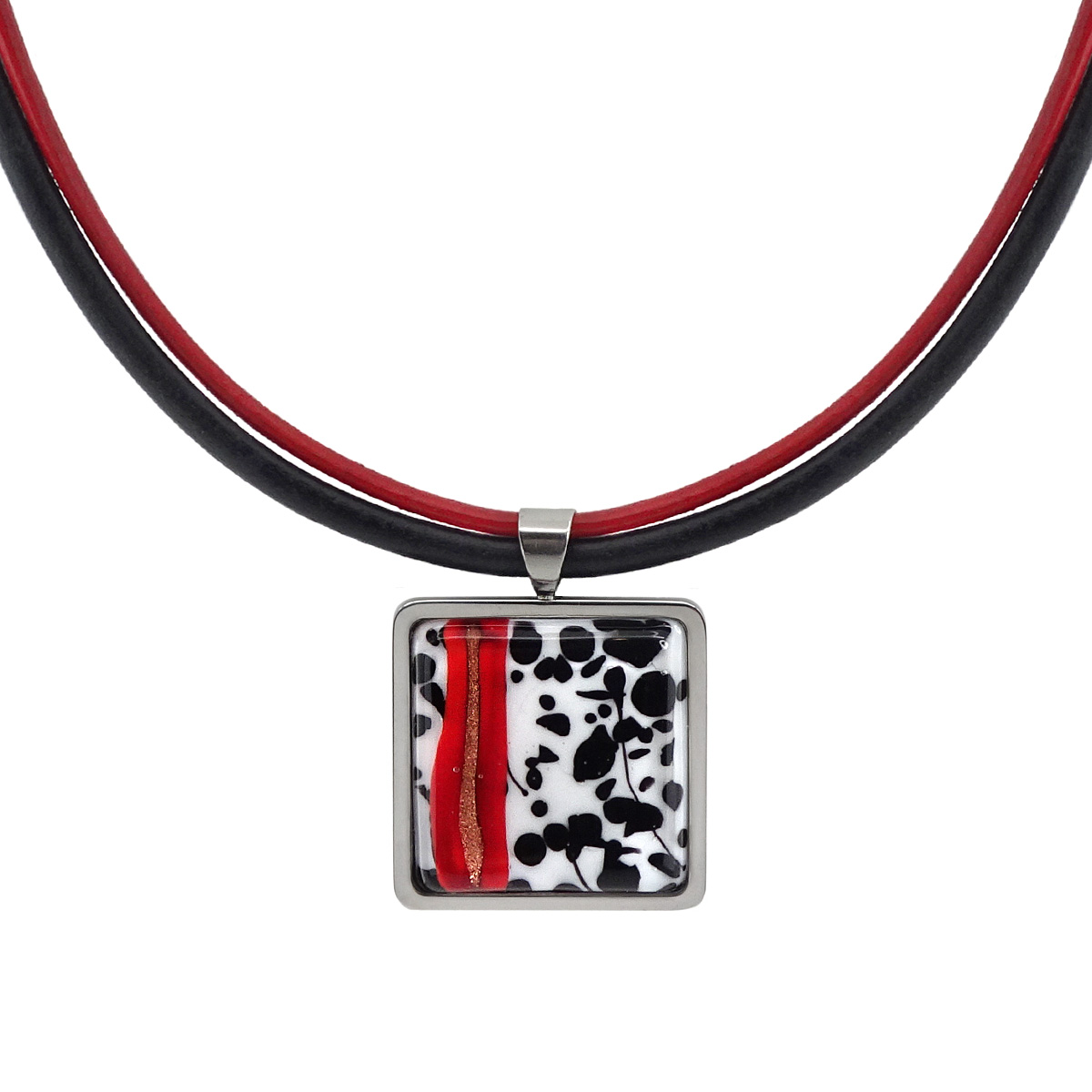 Колье изготовлено из натуральной кожи, муранского стекла и гипоаллергенной ювелирной стали, что очень важно для людей с чувствительной кожей. Металл не темнеет и не подвергается воздействиям окружающей среды, надолго обеспечивая красивый внешний вид изделия. Длина колье - 46 см + 5 см. удлиняющая цепочка. Размер стеклянного элемента - 2,2х2,2 см.  Вес -  20 гр.