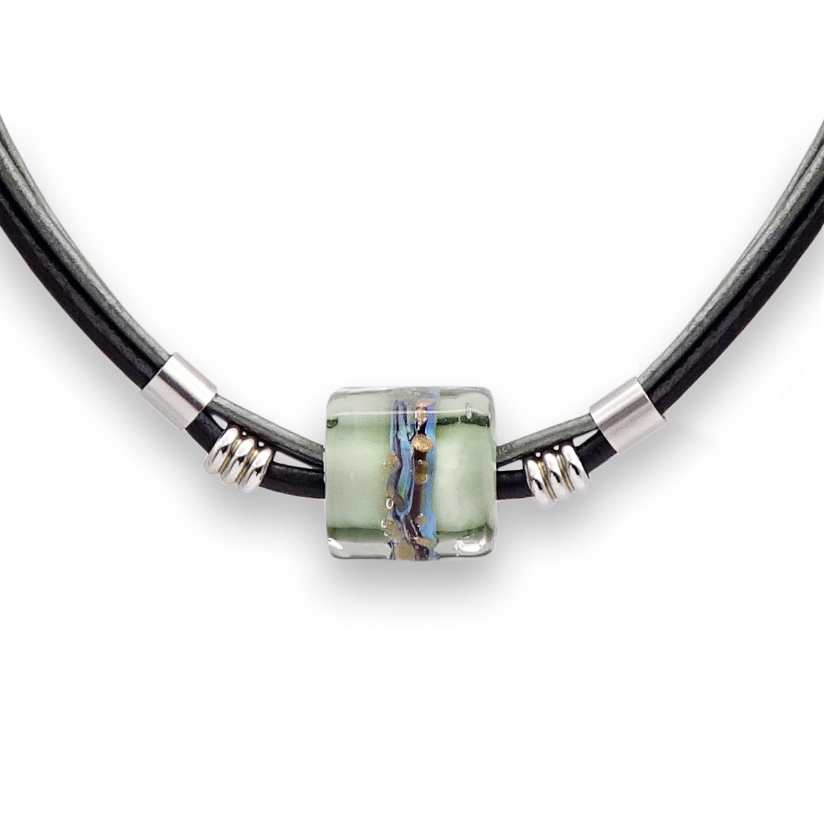 Колье изготовлено из натуральной кожи, муранского стекла и гипоаллергенной ювелирной стали, что очень важно для людей с чувствительной кожей. Металл не темнеет и не подвергается воздействиям окружающей среды, надолго обеспечивая красивый внешний вид изделия. Длина колье - 46 см + 5 см. удлиняющая цепочка. Размер стеклянной бусины - 1,8х1,8 см. Вес - 22 гр.