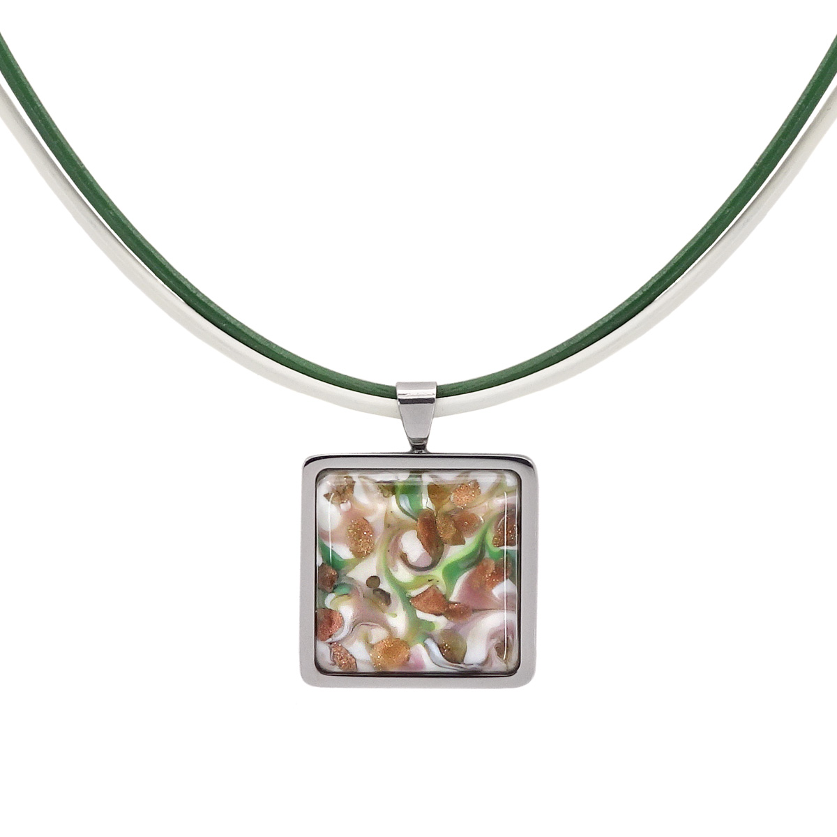 Колье изготовлено из натуральной кожи, муранского стекла и гипоаллергенной ювелирной стали, что очень важно для людей с чувствительной кожей. Металл не темнеет и не подвергается воздействиям окружающей среды, надолго обеспечивая красивый внешний вид изделия. Длина колье - 46 см + 5 см. удлиняющая цепочка. Размер стеклянного элемента - 2,2х2,2 см.  Вес -  18 гр.