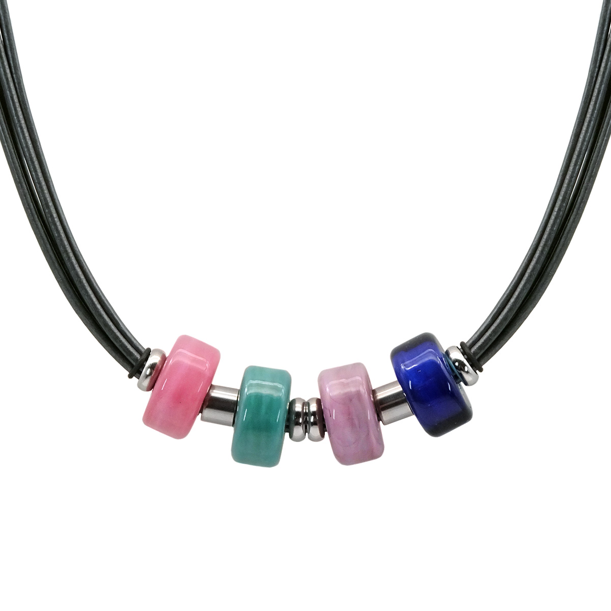 Колье изготовлено из натуральной кожи, муранского стекла и гипоаллергенной ювелирной стали, что очень важно для людей с чувствительной кожей. Металл не темнеет и не подвергается воздействиям окружающей среды, надолго обеспечивая красивый внешний вид изделия. Длина колье - 50 см + 5 см. удлиняющая цепочка. Размер стеклянных ронделей - 0,7*2. Вес - 31 гр.