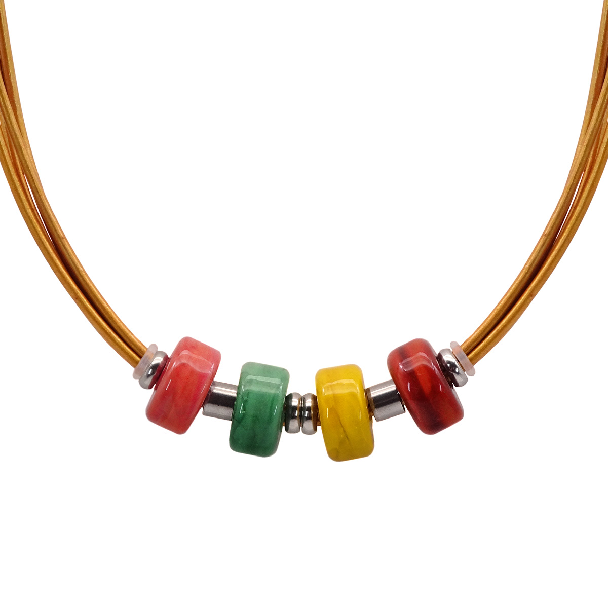 Колье изготовлено из натуральной кожи, муранского стекла и гипоаллергенной ювелирной стали, что очень важно для людей с чувствительной кожей. Металл не темнеет и не подвергается воздействиям окружающей среды, надолго обеспечивая красивый внешний вид изделия. Длина колье - 50 см + 5 см. удлиняющая цепочка. Размер стеклянных ронделей -  0,7*2. Вес - 35 гр.