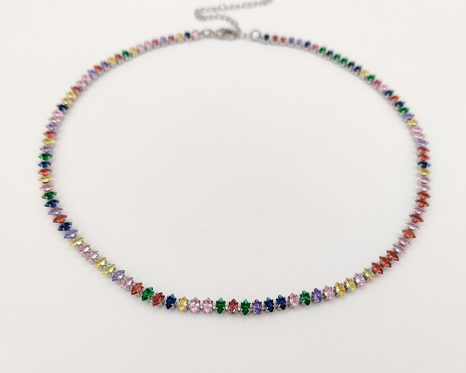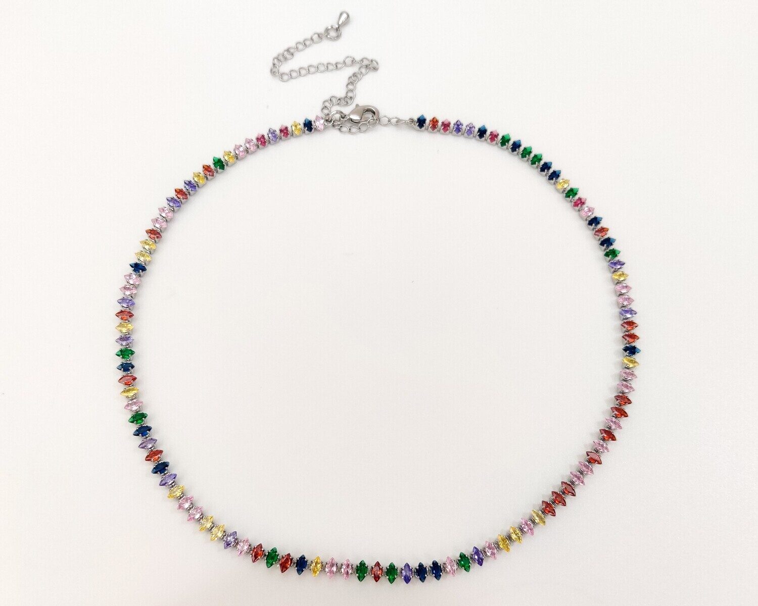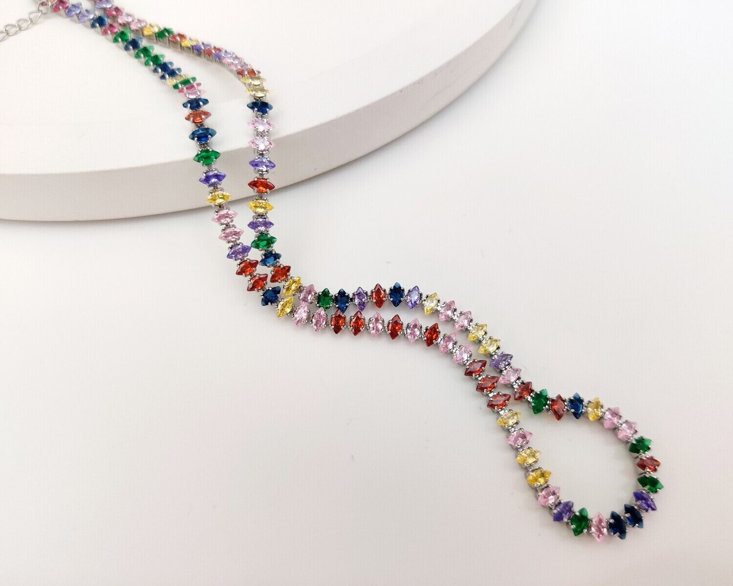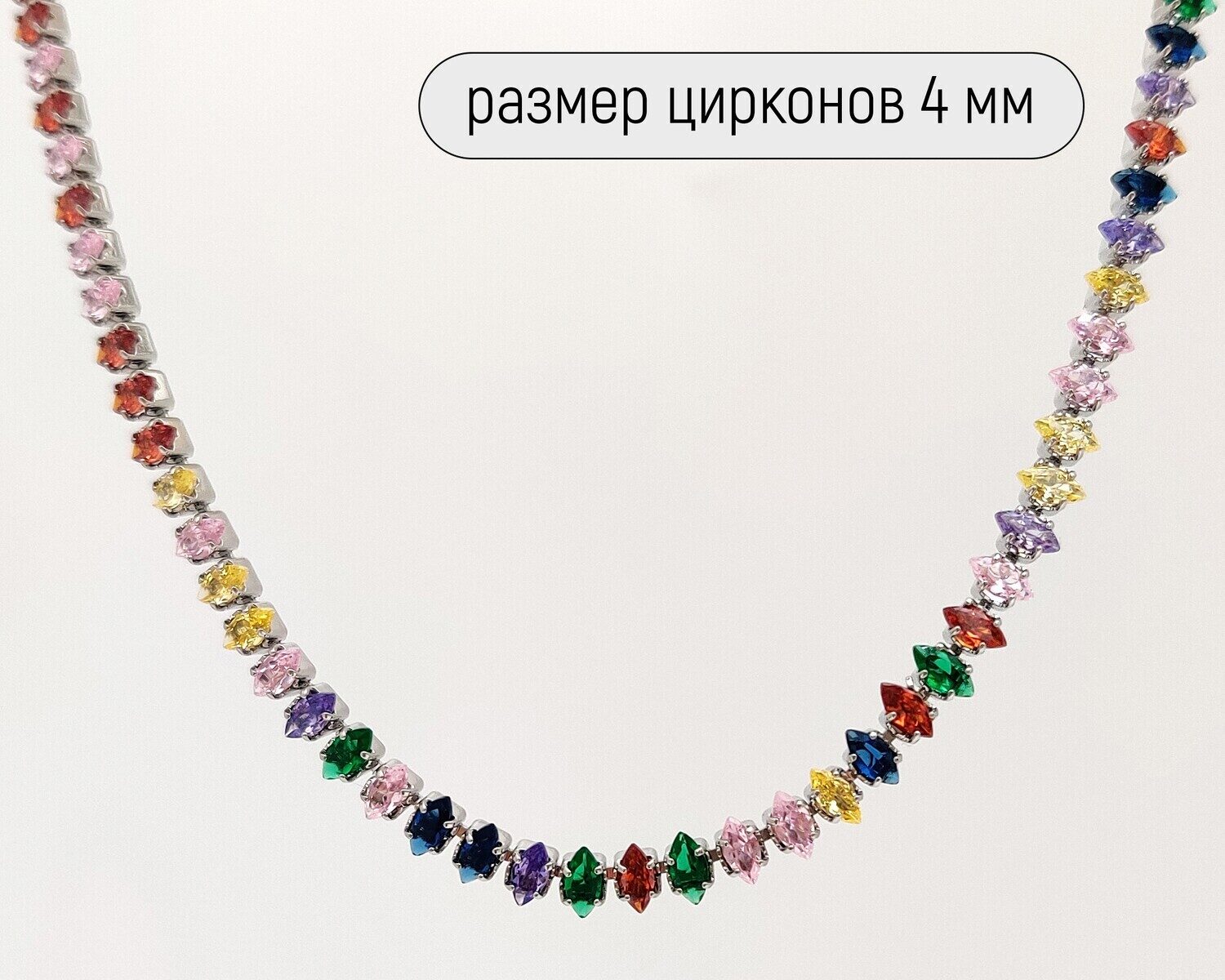 Стильное колье с цирконами имеет высокую износостойкость, не окисляется, не темнеет, не вызывает аллергии.