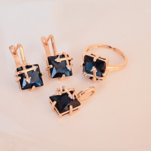 Комплект с крупным камнем ювелирной бижутерии коллекция "Дубай" серьги, кулон и кольцо 18 р, покрытие позолота, вставка: фианиты, цвет: синий, арт.213.720-18