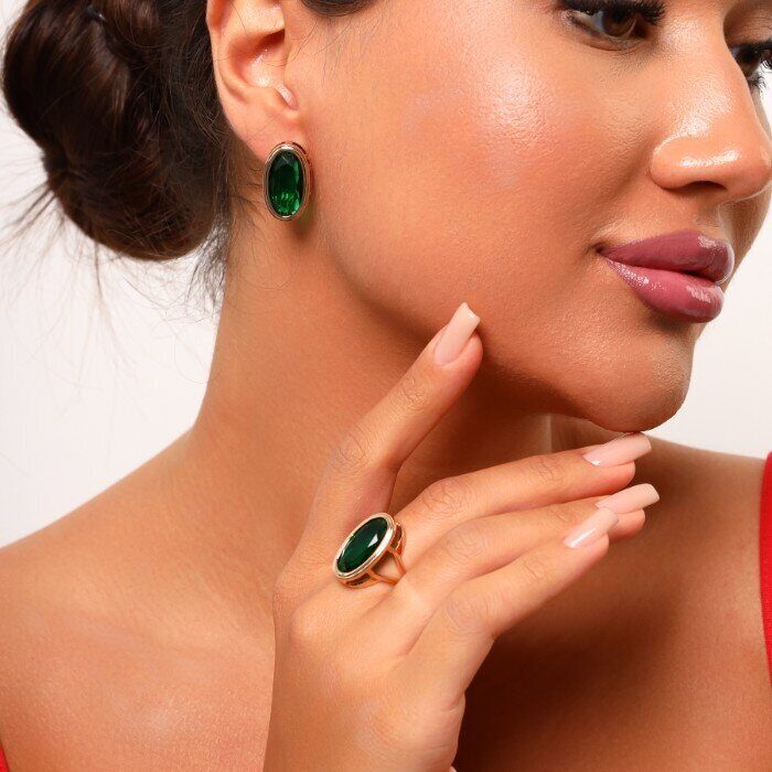 Комплект украшений ювелирная бижутерия Дубайское золото серьги и кольцо, покрытие позолота, вставка: камень, цвет: изумрудный, р р 20, арт.215.054-20