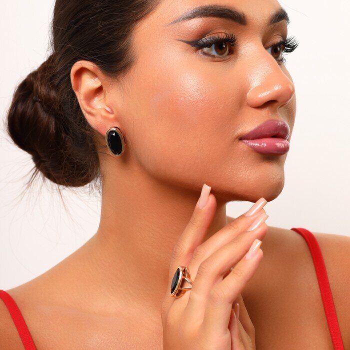 Комплект украшений ювелирная бижутерия Дубайское золото серьги и кольцо, покрытие позолота, вставка: камень, цвет: черный, р р 18, арт.215.056-18