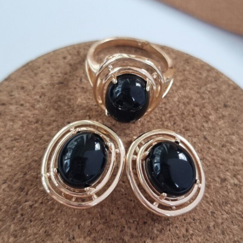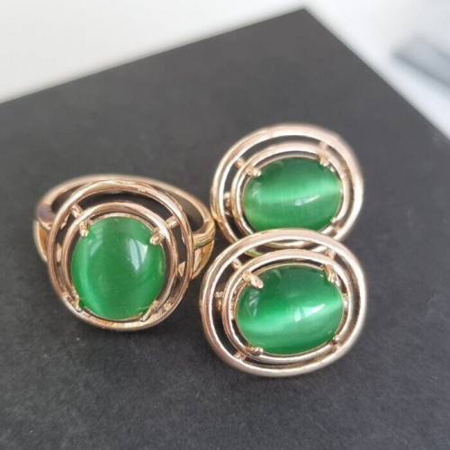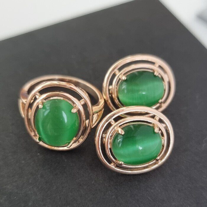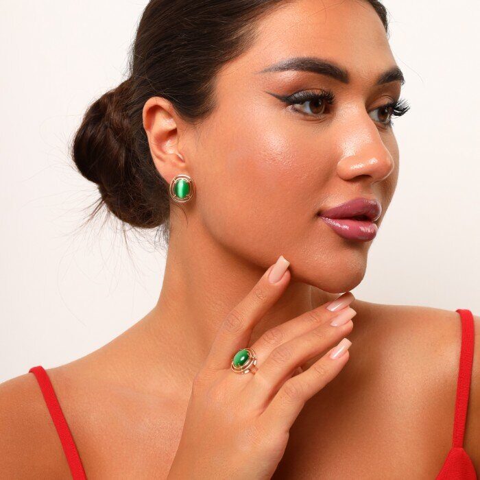 Комплект украшений ювелирная бижутерия Дубайское золото серьги и кольцо, покрытие позолота, вставка: камень кошачий глаз, цвет: зеленый, р р 17, арт.215.063-17