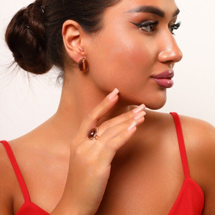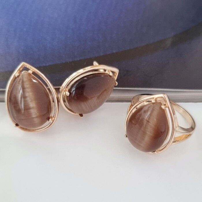 Комплект украшений ювелирная бижутерия Дубайское золото серьги и кольцо, покрытие позолота, вставка: камень кошачий глаз, цвет: коричневый, р р 19, арт.215.064-19