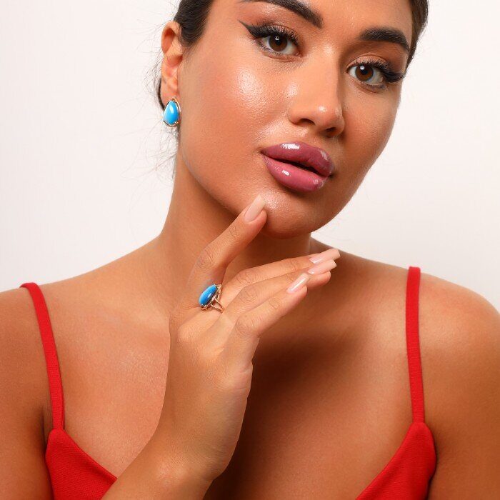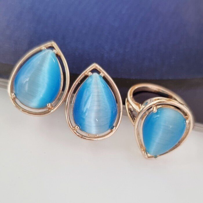 Комплект украшений ювелирная бижутерия Дубайское золото серьги и кольцо, покрытие позолота, вставка: камень кошачий глаз, цвет: синий, р р 19, арт.215.065-19