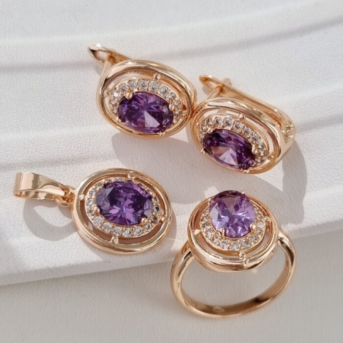 Комплект в форме сердца ювелирная бижутерия коллекция "Дубай" серьги, кулон и кольцо 20 р, покрытие: позолота, вставка: фианиты, цвет: прозрачный и фиолетовый, арт.213.773-20