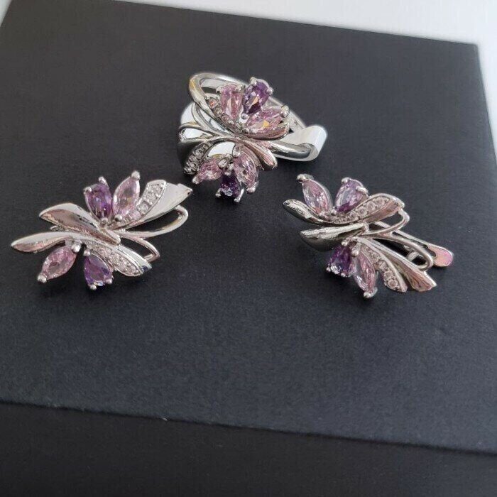 Комплект ювелирная бижутерия, серьги и кольцо посеребрение, камни цвет розово-фиолетовый, р-р 17, 76168, арт.947.084-17
