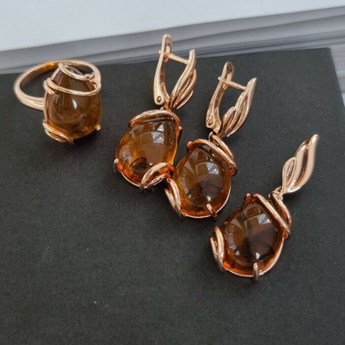 Описание Размер кольца: 18. Размер серёжек: 3,7*1,3 см. Размер кулона: 3,5*1,3 см. Замок: английский. Материал: бижутерный сплав, иск.янтарь. Вес: 13 гр.(цепочка в комплект не входит)