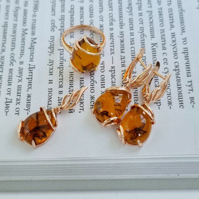 Описание Размер кольца: 19. Размер серёжек: 3,7*1,3 см. Размер кулона: 3,5*1,3 см. Замок: английский. Материал: бижутерный сплав, иск.янтарь. Вес: 13 гр.