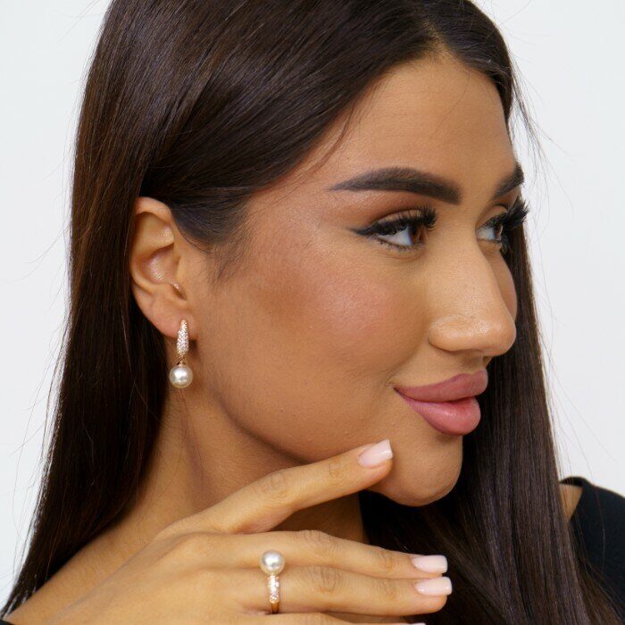 Описание Размер кольца: 19. Размер серёжек: 2,8*0,8 см. Замок: английский. Материал: бижутерный сплав, иск.жемчуг, фианиты. Вес: 7 гр.