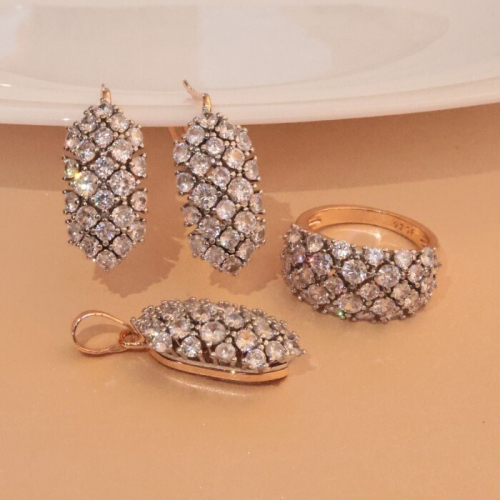 Комплект ювелирной бижутерии Дубайское золото с покрытием позолотой, серьги, кулон и кольцо 18 р, вставка: фианиты, цвет: прозрачный, арт.213.732-18