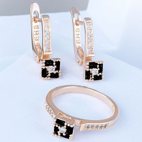 Комплект ювелирной бижутерии коллекция "Дубай" серьги и кольцо 19 р, покрытие позолота, вставка: фианиты, цвет: прозрачный и черный, арт.214.982-19