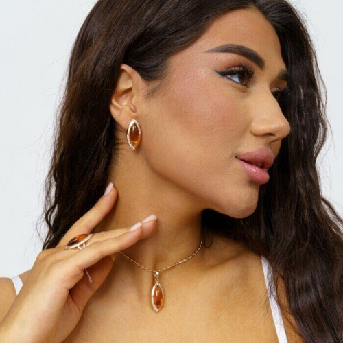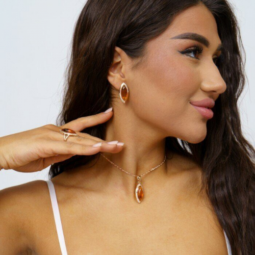Описание Размер кольца: 18. Размер серёжек: 2,8*1,2 см. Замок: английский. Материал: бижутерный сплав, янтарь, фианиты. Вес: 15 гр. Цепочка в комплект не входит!