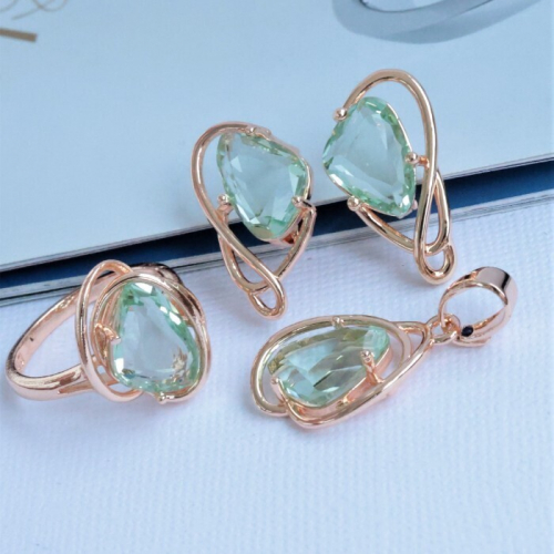 Комплект ювелирной бижутерии коллекция "Дубай" серьги, кулон и кольцо 19 р, покрытие позолота, вставка: фианит крупный, цвет: светло-зеленый, арт.214.996-19