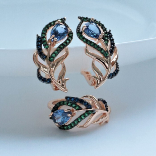 Комплект ювелирной бижутерии коллекция "Дубай" в форме перешка серьги и кольцо 19 р, покрытие позолота, вставка: фианиты, цвет: зеленый и синий, арт.214.999-19