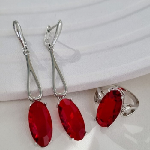Комплект ювелирной бижутерии коллекция серьги и кольцо 19 р, покрытие: посеребрение, вставка: фианит, цвет: красный, арт.213.764-19