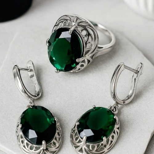 Комплект ювелирной бижутерии с крупным камнем серьги и кольцо 18 р, цвет: зеленый, Уценка, арт.08.3409 (213.921-18 )