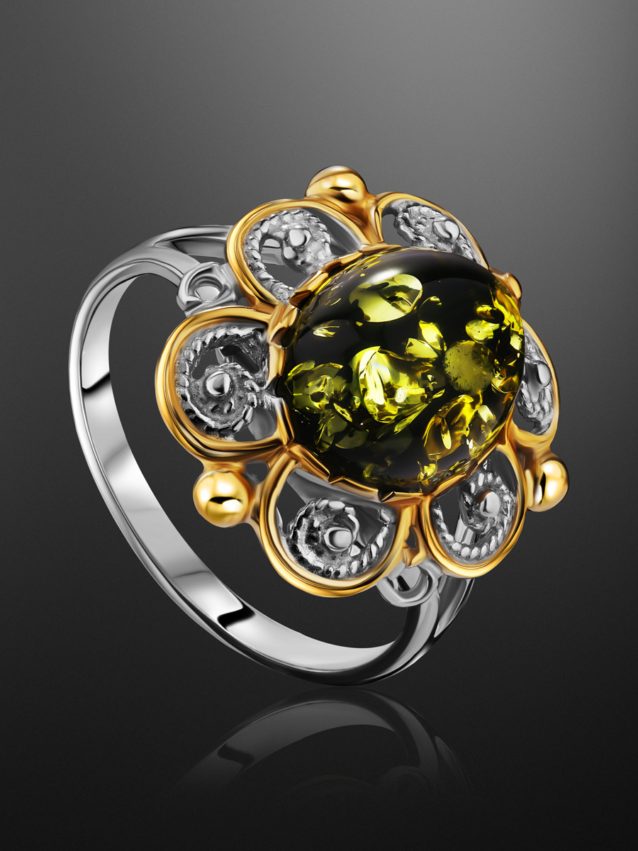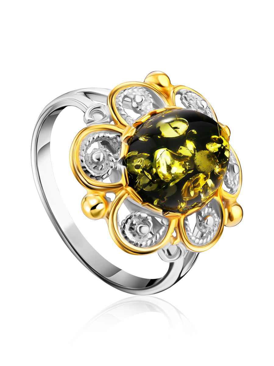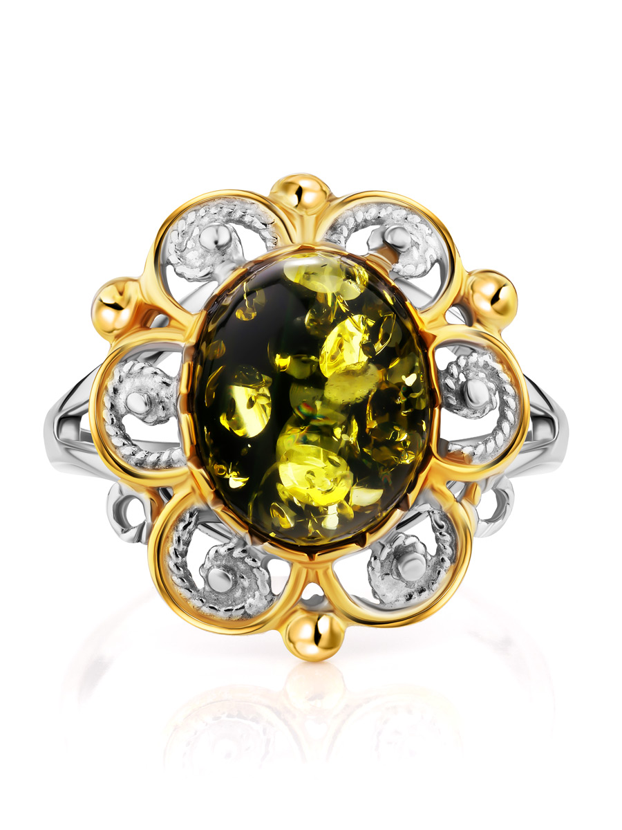 Красивое ажурное кольцо «Мальвина» из зелёного янтаря