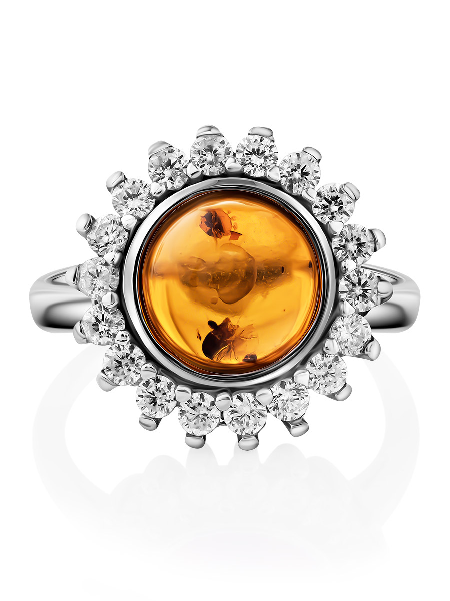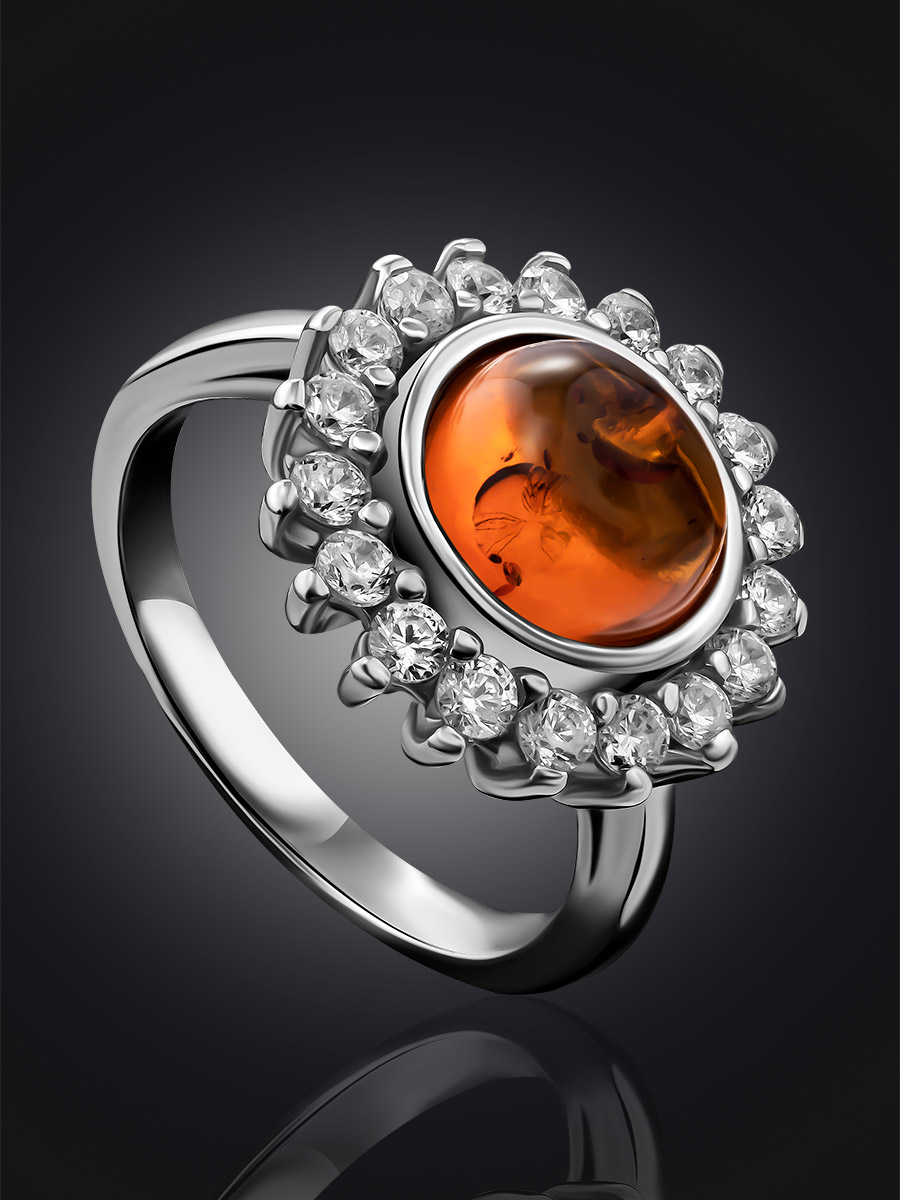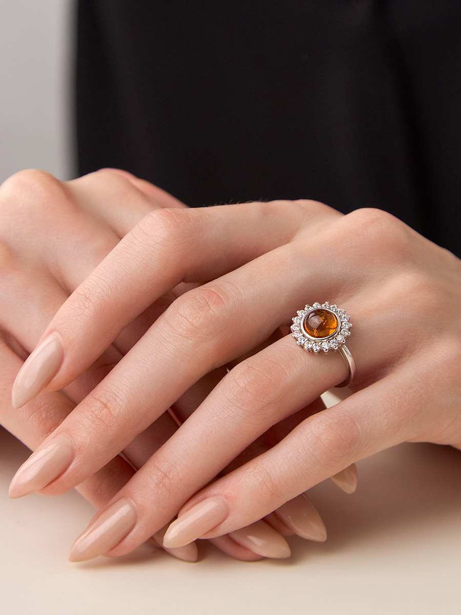 Красивое кольцо из коньячного янтаря с фианитами «Ренессанс»