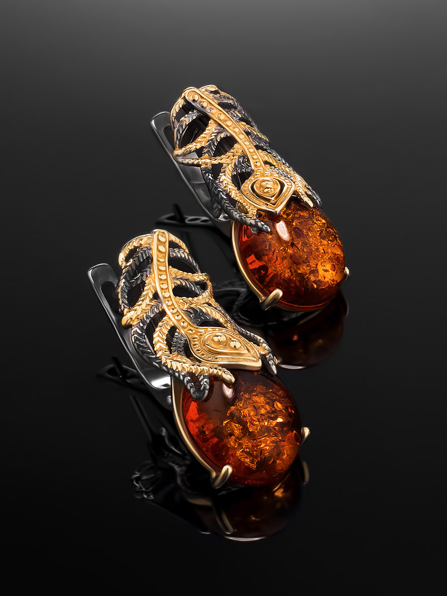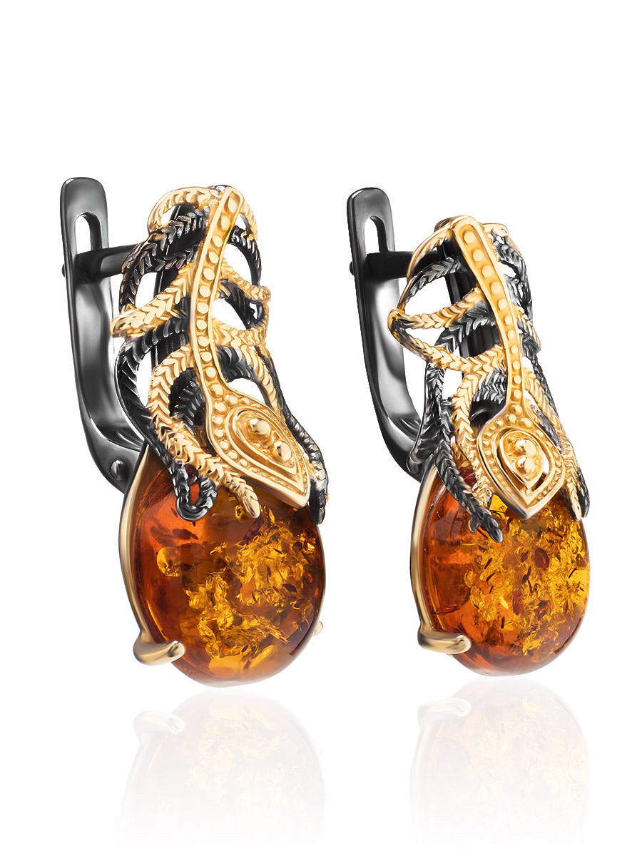 Красивые серьги «Павлин» из коньячного янтаря с позолотой