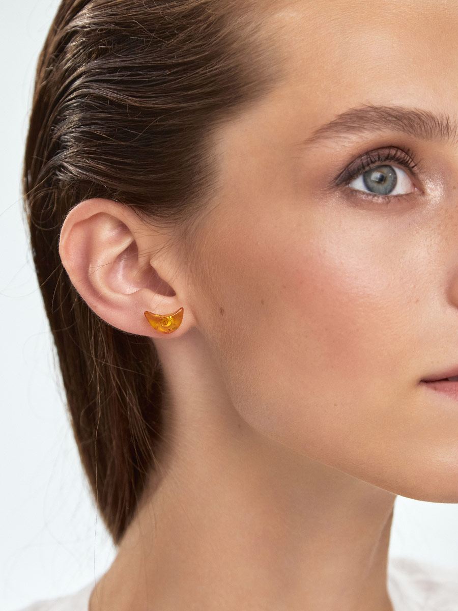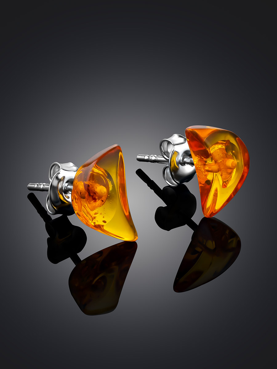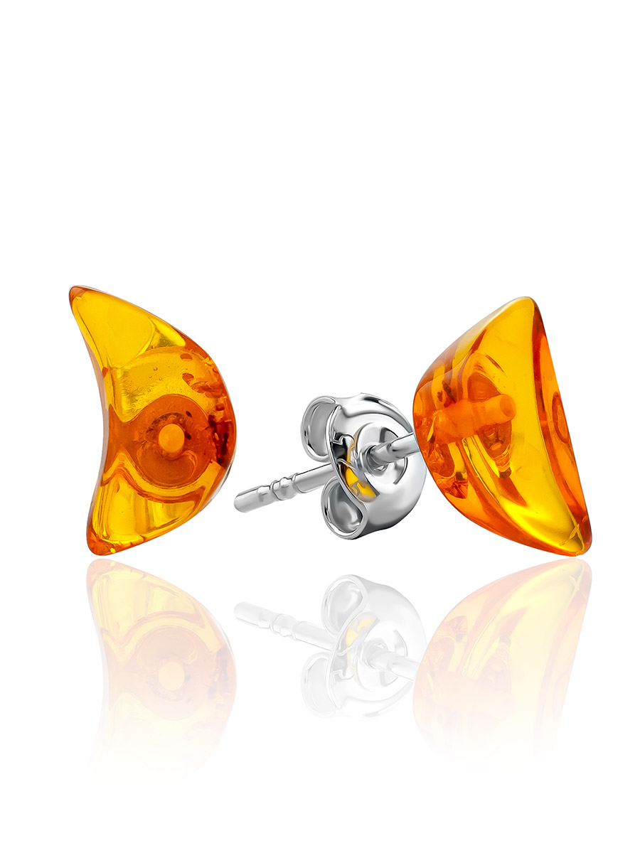 Маленькие изящные серьги-гвоздики из натурального янтаря «Коньячные полумесяцы»