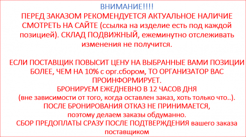 - Наличие, размеры и цена товара указаны на день открытия сбора и к моменту выкупа может не много измениться в большую сторону. Если рост цен будет в рамках, предусмотренных правилами СП, т.е. не более 10 % с орг. сбором (без учета ТР) - выкупаю товар без предварительного уведомления участника. ЕСЛИ ПОСТАВЩИК ПОВЫСИТ ЦЕНУ НА ВЫБРАННЫЕ ВАМИ ПОЗИЦИИ БОЛЕЕ, ЧЕМ НА 10% с орг.сбором, ТО ОРГАНИЗАТОР ВАС ПРОИНФОРМИРУЕТ