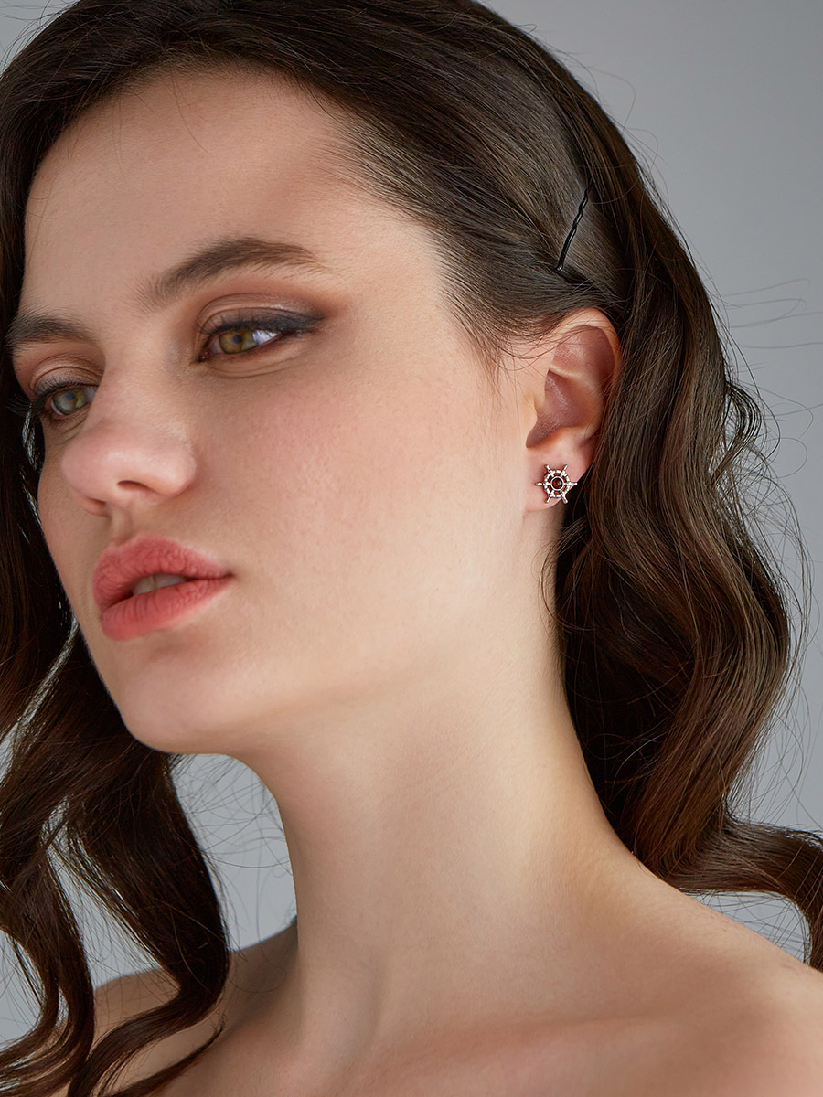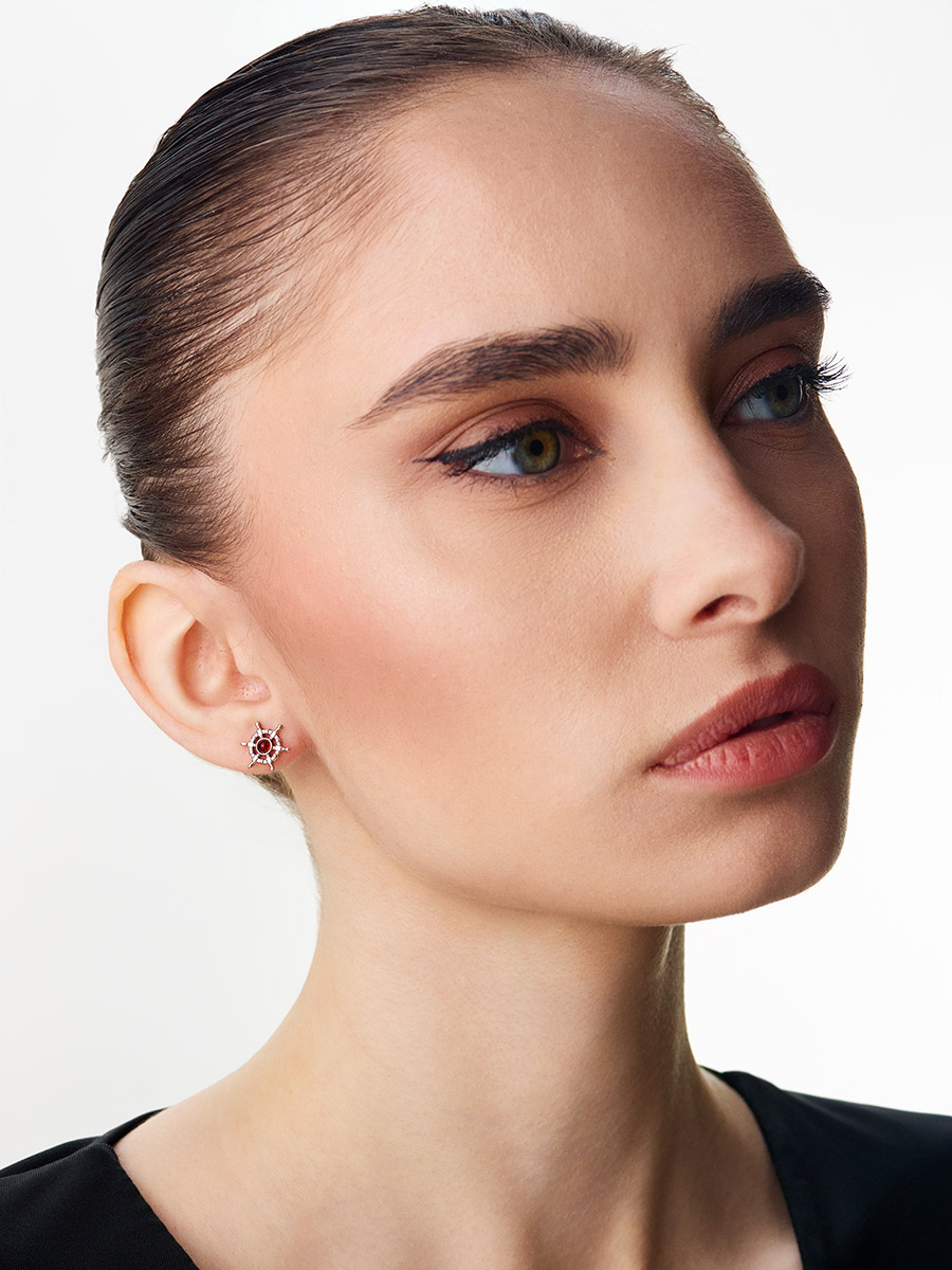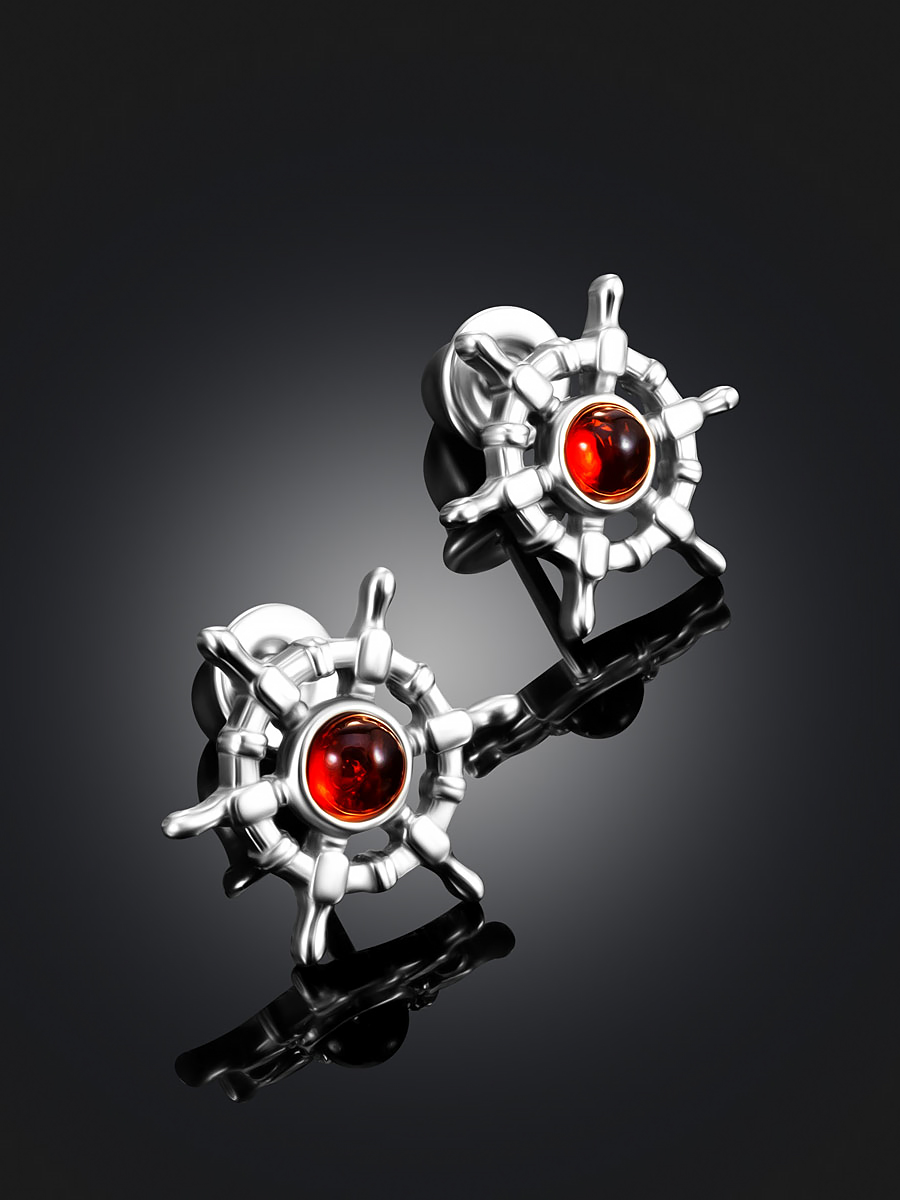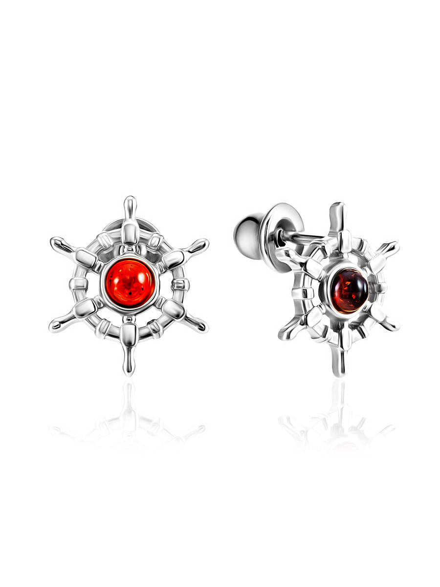 Миниатюрные серьги-гвоздики «Штурвал» с натуральным коньячным янтарём