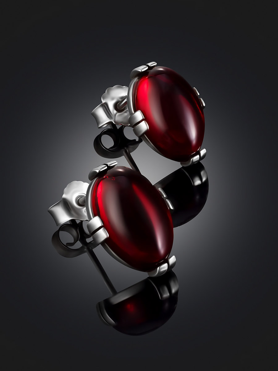 Небольшие лёгкие серьги-гвоздики с красным янтарём «Сангрил»