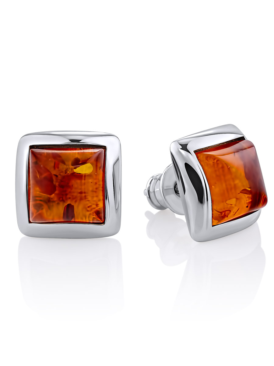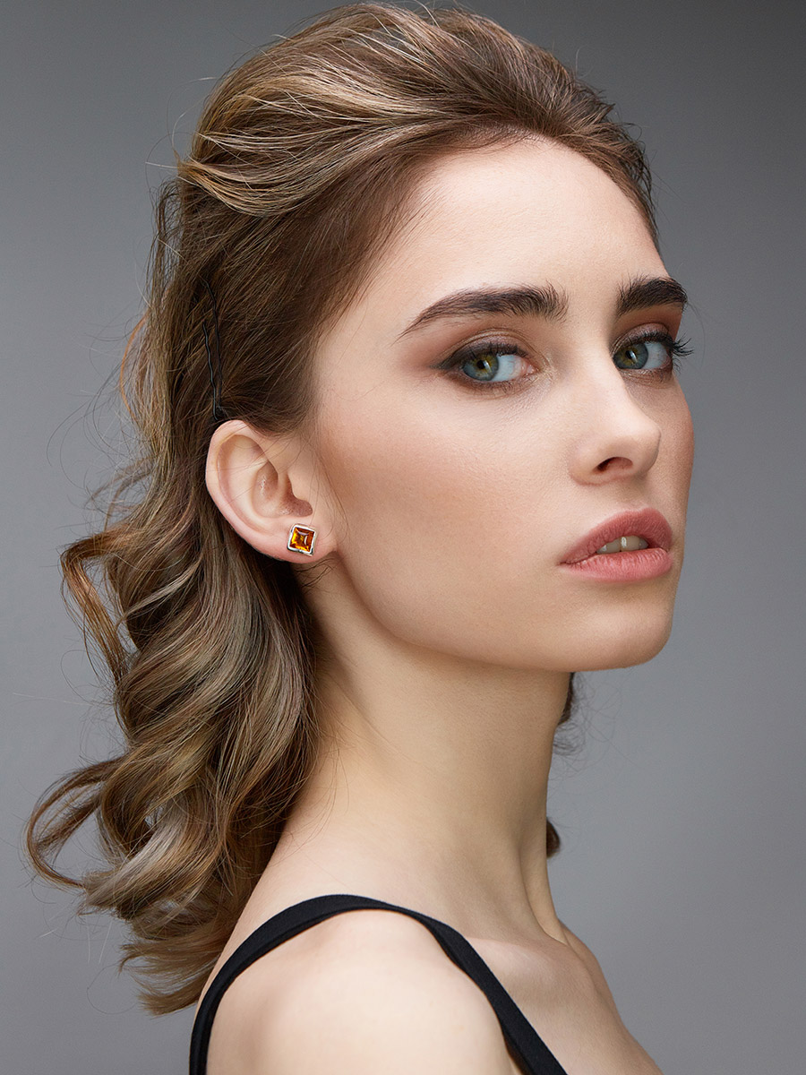 Небольшие пусеты «Квадрат» с янтарём чайного оттенка