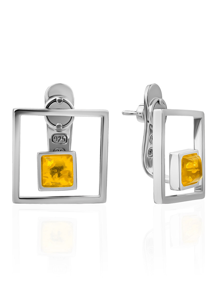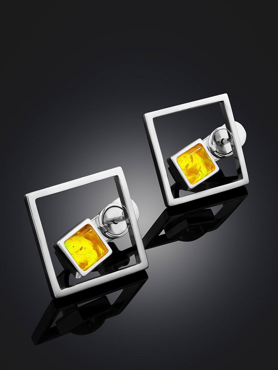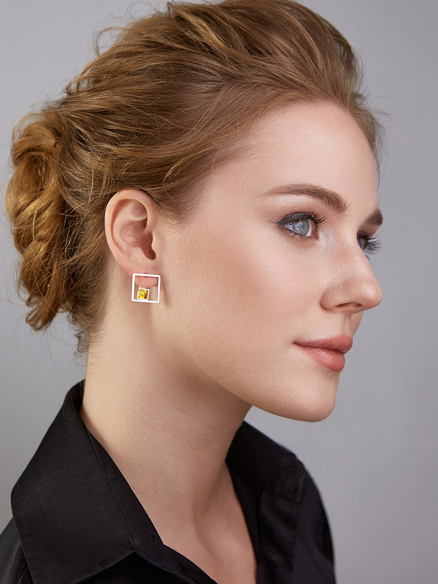 Необычные серьги-гвоздики с натуральным лимонным янтарём «Гравитация»