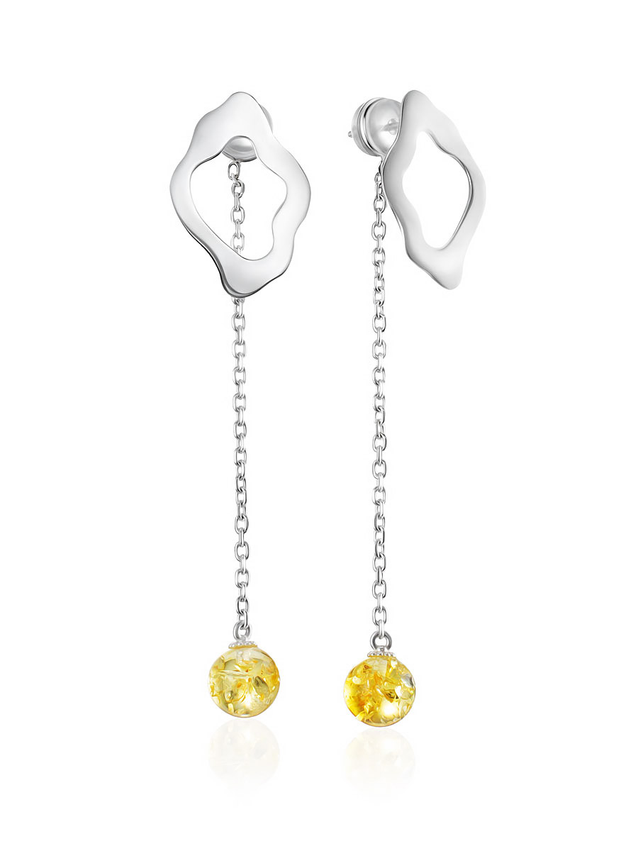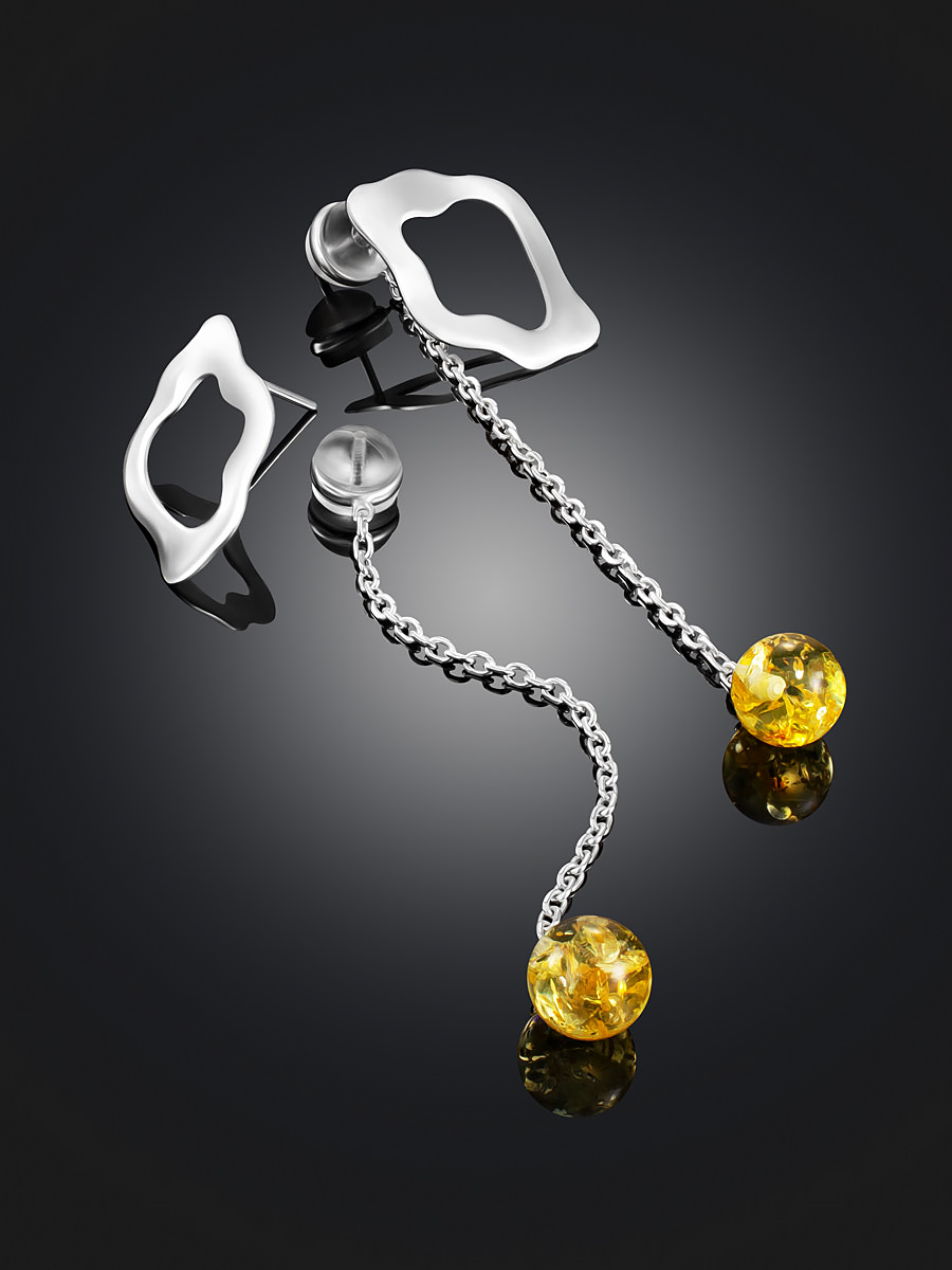 Необычные серьги-гвоздики с янтарным шариком на цепочке «Облачко»