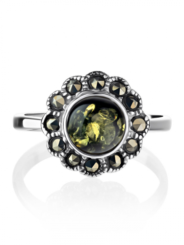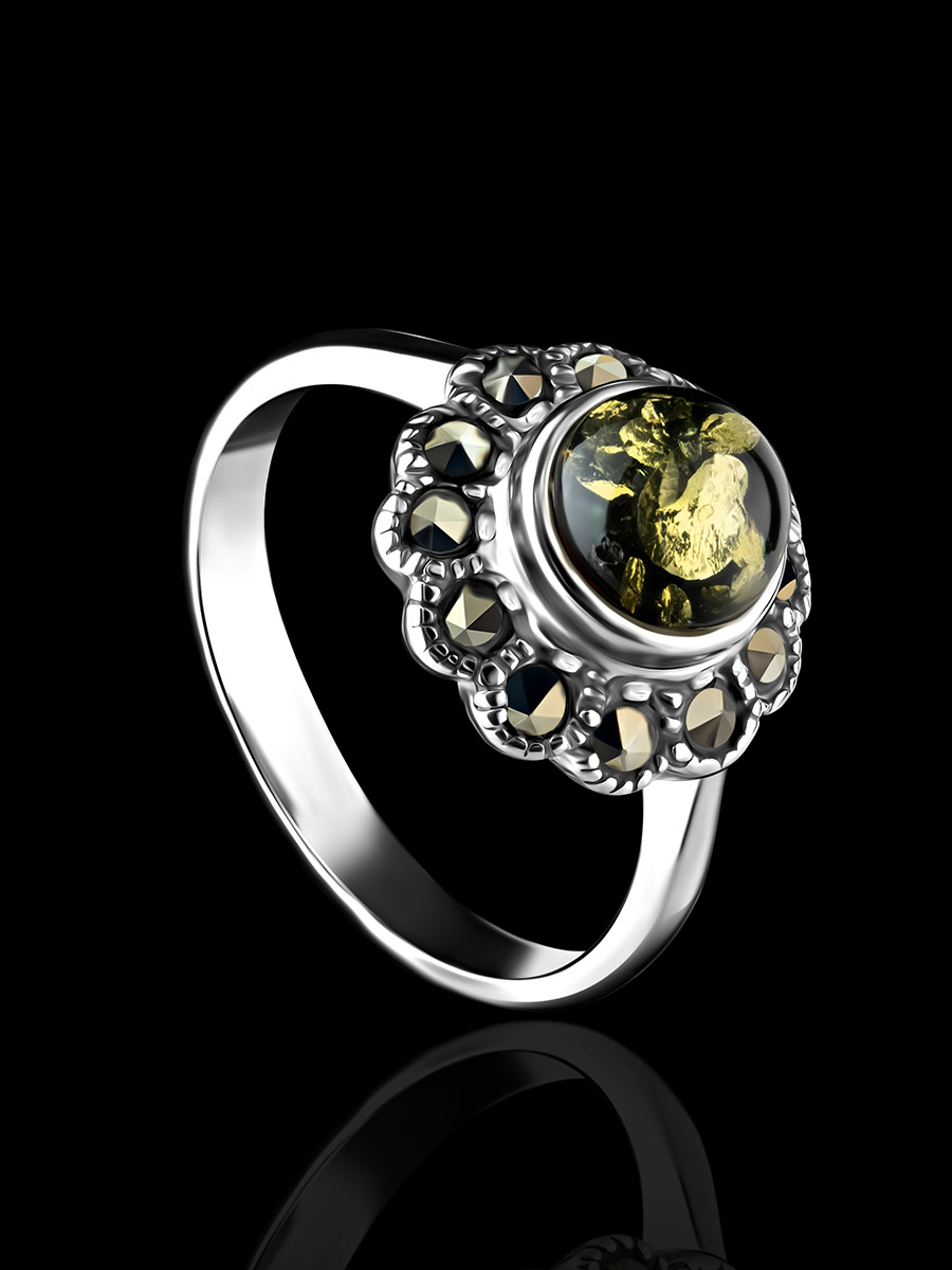 Очаровательное кольцо «Эйфория» с зелёным янтарём и марказитами